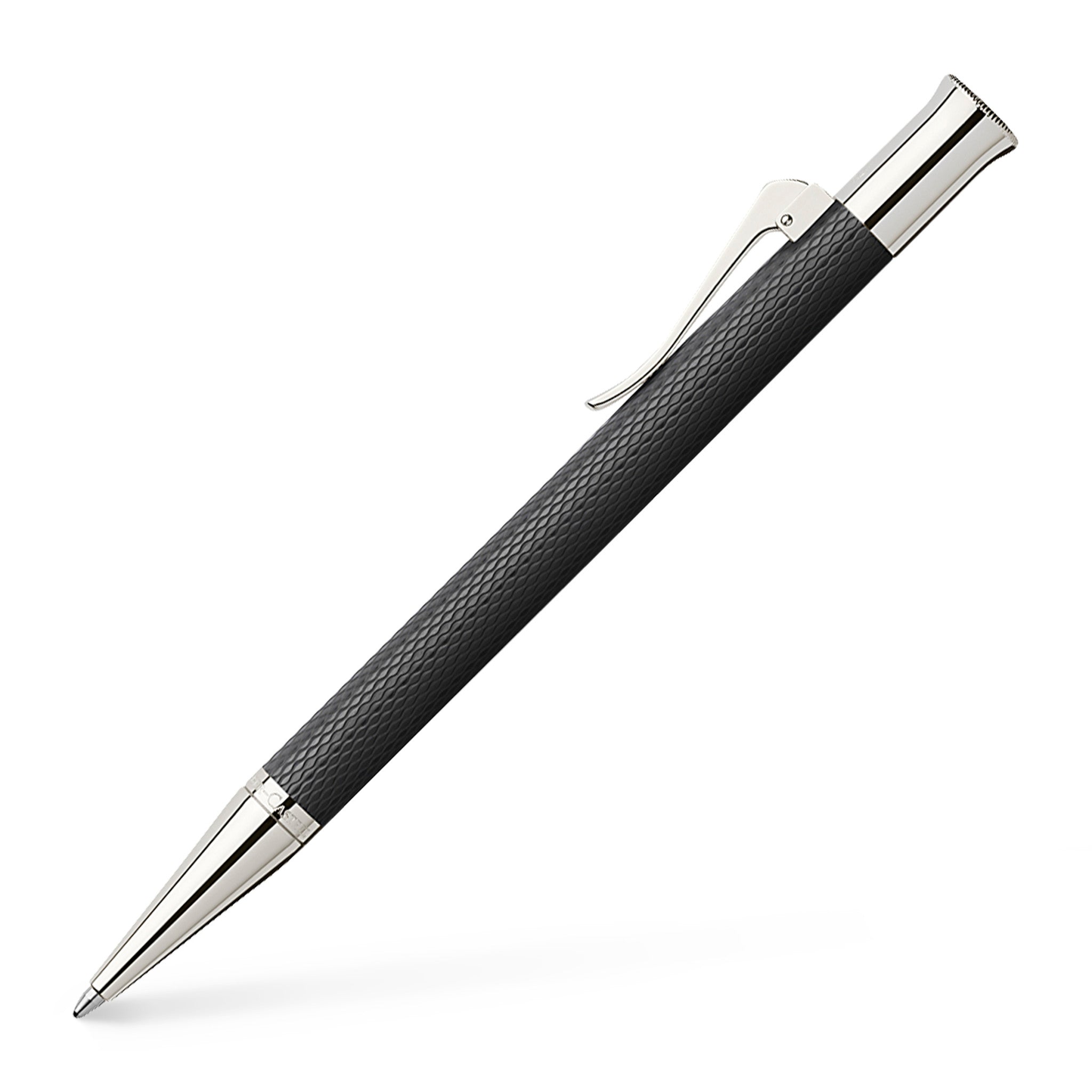 Ballpoint pen with elaborately engraved guilloche pattern in the black precious resin barrel. Manufacturing process involves over a hundred steps, most of them carried out by hand. Packaged in chamois-colored gift box. Equipped with a large capacity refill in standard size. Ink color: black. Rhodium-plated metal pieces.