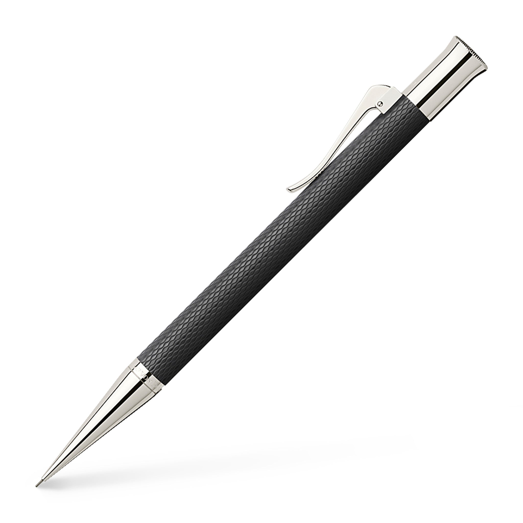 Mechanical pencil with elaborately engraved guilloche pattern in the black precious resin barrel. Deep matte surface combined with shimmering engraving. High-gloss rhodium-plated metal pieces. Break resistant 0.7 mm leads of hardness B. Reservoir for spare leads. Replaceable white eraser under the end cap.