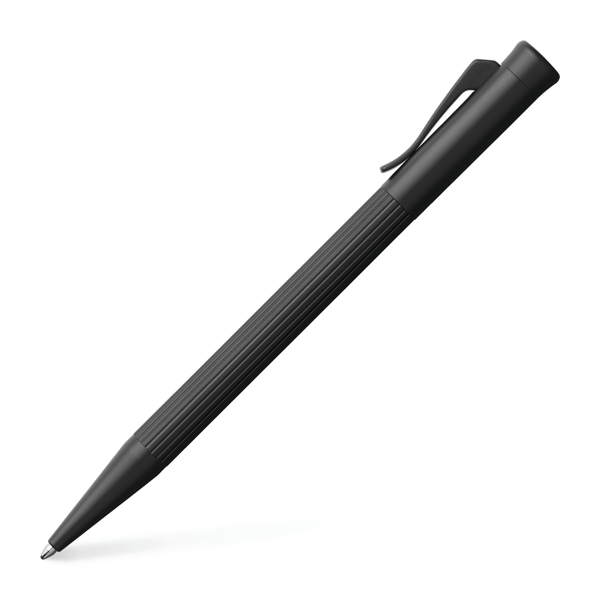 Tamitio ballpoint pen in all black. Finely fluted barrel made of matte black metal. Black metal fittings. Solid, spring-loaded metal clip. Equipped with a large-capacity refill in standard size. Chamoise-colored gift box.